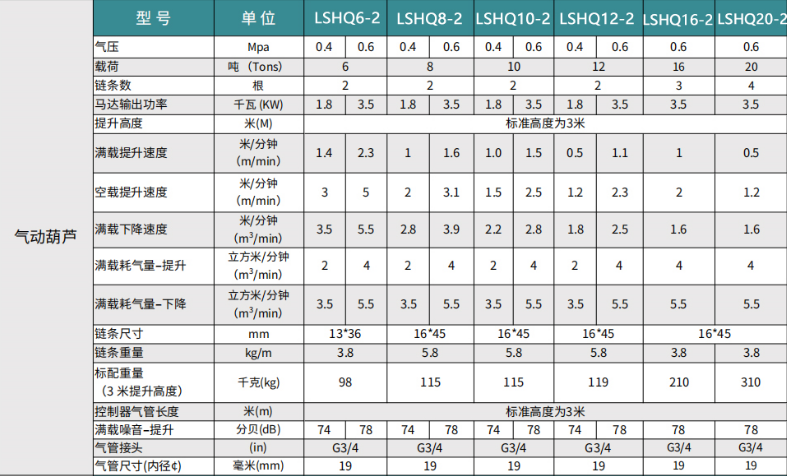 LSHQ型環(huán)鏈氣動葫蘆中規(guī)格參數: